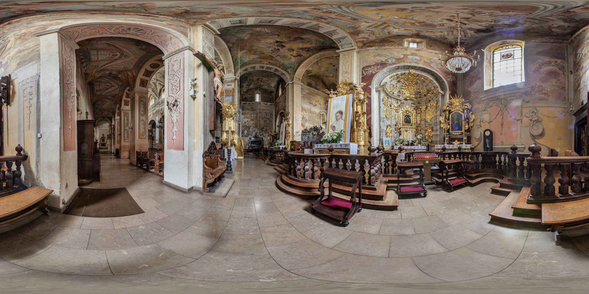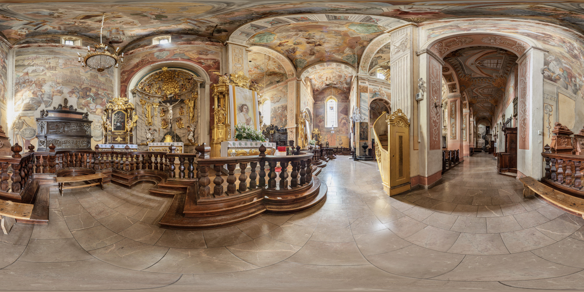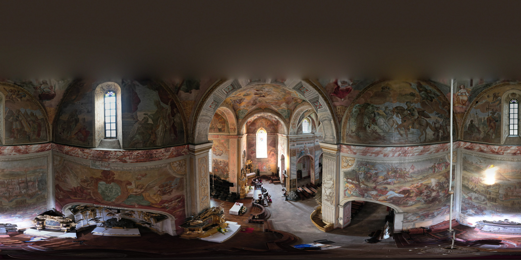 The most prominent of the tombs, sculpted between 1533 and 1541, belongs to the chancellor, and is among the greatest examples of Polish Renaissance tomb sculptures. Its most famous element is known as the Opatów Lament, a brass slab depicting a group of characters engaged in a discussion while standing around a table positioned in the centre of the composition. The scene is often interpreted as depicting courtiers lamenting the news of Chancellor Szydłowiecki’s death, but the actual intended meaning of the piece remains unknown. Of special significance are the polychrome paintings on the walls and ceilings, which originate from the 16th, 17th and 18th centuries and greatly contribute to the aesthetics of the church. By far the most striking works of art adorning the building are the large-format depictions of the Battle of Psie Pole, the Battle of Grunwald and the Battle of Vienna on the walls of the transept and chancel.