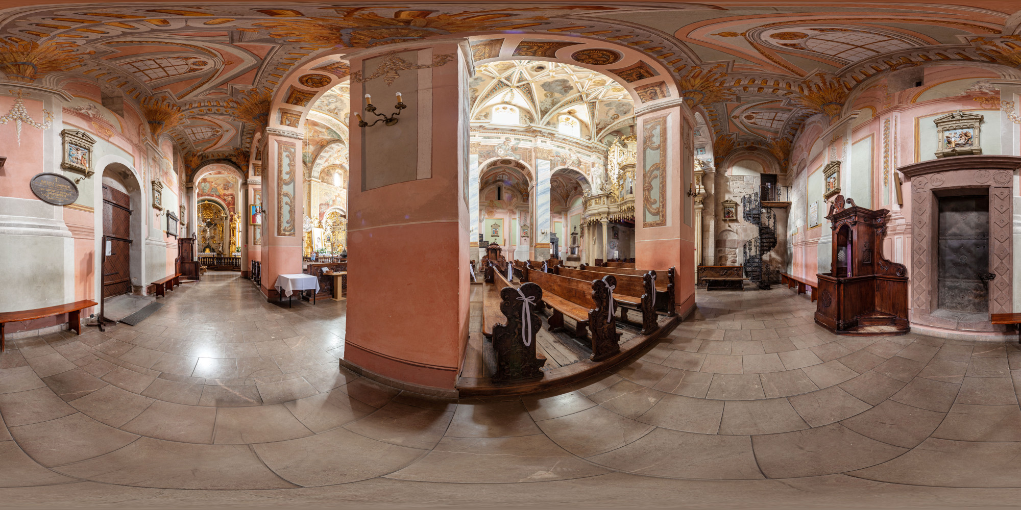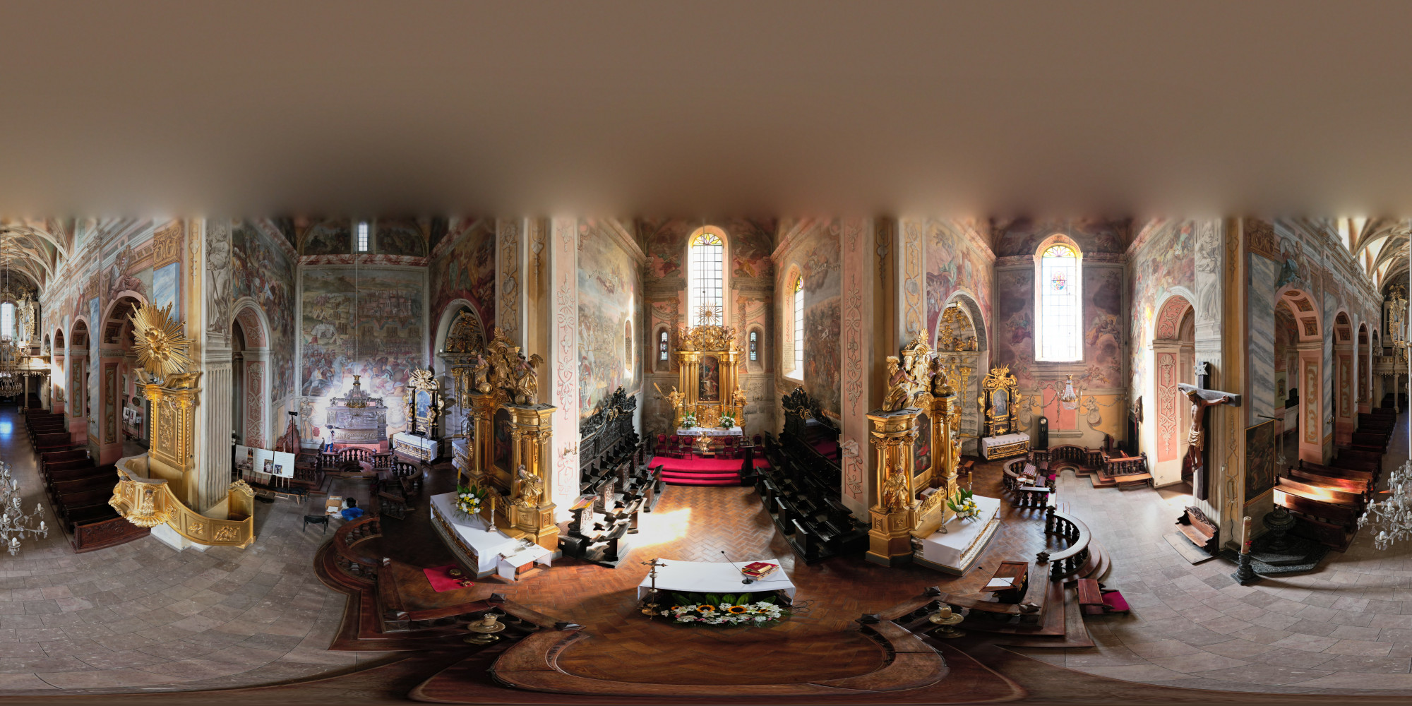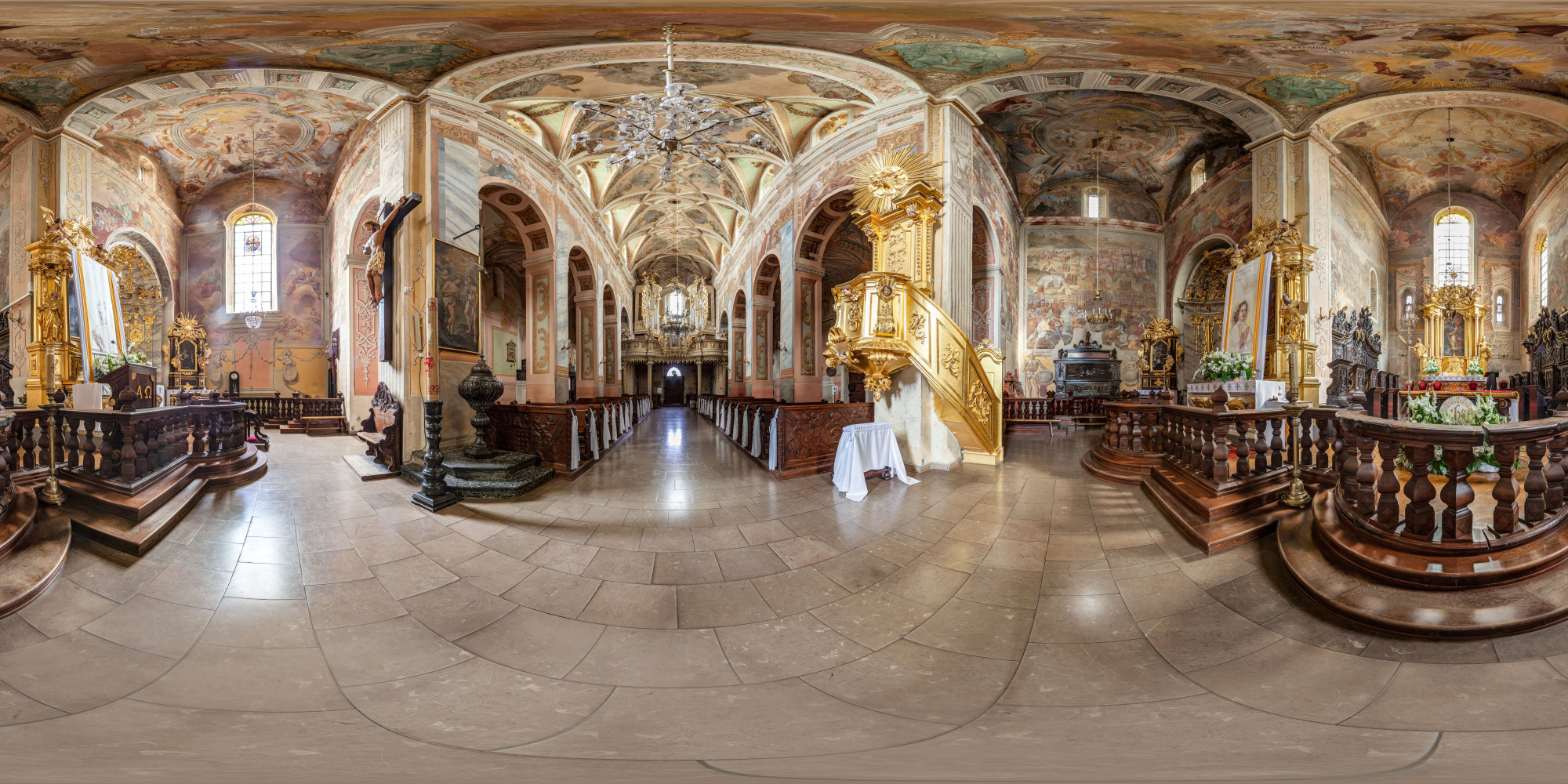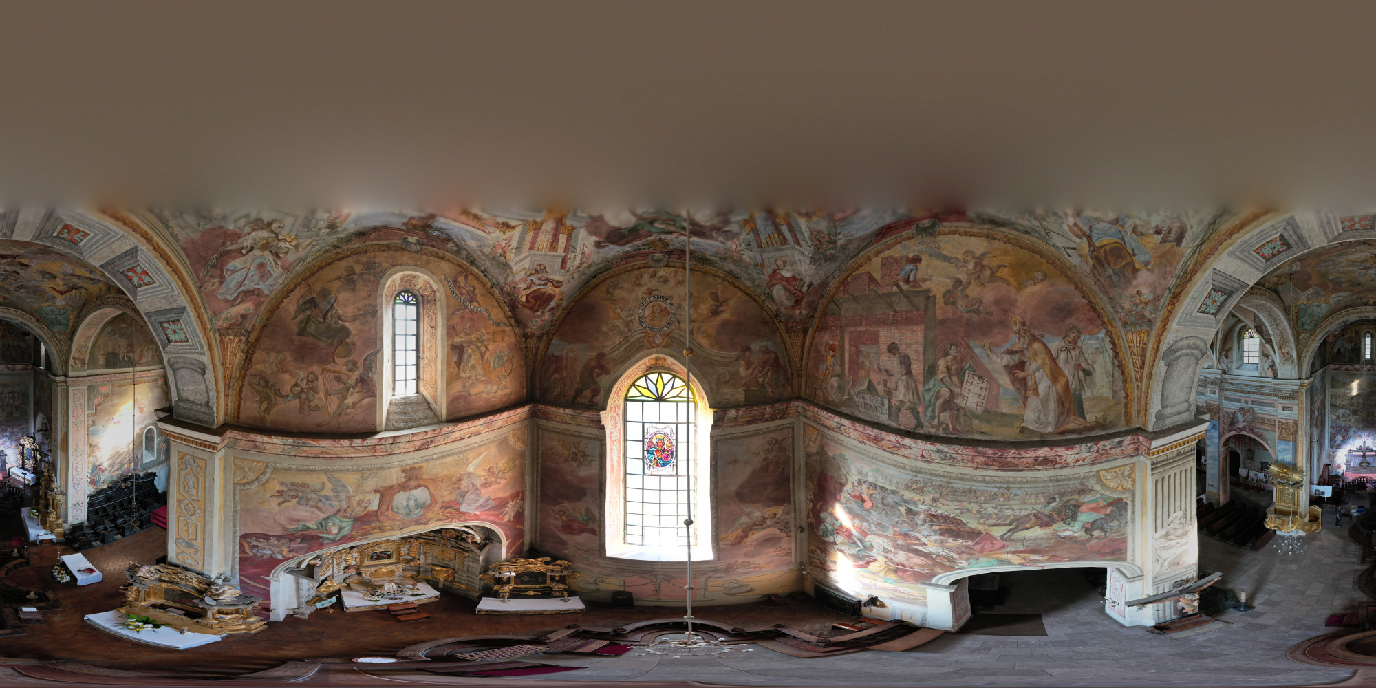 The most prominent of the tombs, sculpted between 1533 and 1541, belongs to the chancellor, and is among the greatest examples of Polish Renaissance tomb sculptures. Its most famous element is known as the Opatów Lament, a brass slab depicting a group of characters engaged in a discussion while standing around a table positioned in the centre of the composition. The scene is often interpreted as depicting courtiers lamenting the news of Chancellor Szydłowiecki’s death, but the actual intended meaning of the piece remains unknown. Of special significance are the polychrome paintings on the walls and ceilings, which originate from the 16th, 17th and 18th centuries and greatly contribute to the aesthetics of the church. By far the most striking works of art adorning the building are the large-format depictions of the Battle of Psie Pole, the Battle of Grunwald and the Battle of Vienna on the walls of the transept and chancel.