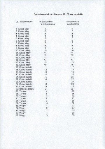 spis stanowisk wg numerów na obszarze