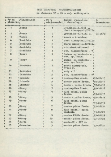 spis stanowisk wg numerów na obszarze