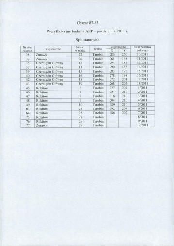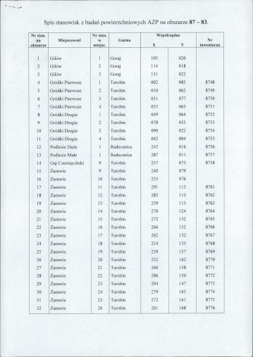 spis stanowisk wg numerów na obszarze